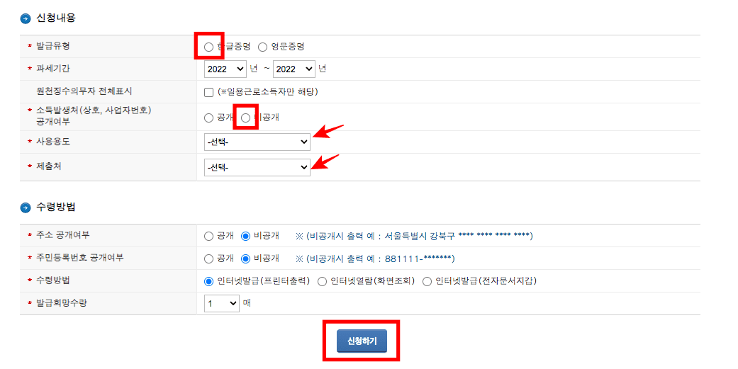 소득금액증명신청서 페이지가 표시되면 먼저 기본 인적 사항을 확인하시기 바랍니다. 이후 신청내용에서 발급유형, 과세기간, 소득발생처 공개여부, 사용용도, 제출처 등을 필요에 맞게 작성하시기 바랍니다.이후 수령방법에서 인터넷발급이 선택되었는지 확인하고 하단의 [신청하기] 버튼을 클릭합니다.