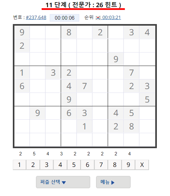 스도쿠 홈페이지에 방문하시면 메인 화면에서 스도쿠 퍼즐을 확인할 수 있습니다. 먼저 스도쿠 푸는요령에서 언급한 데로 행과 열, 작은 사각형에서 주어진 숫자가 가장 많은 요소들을 찾아봅니다.