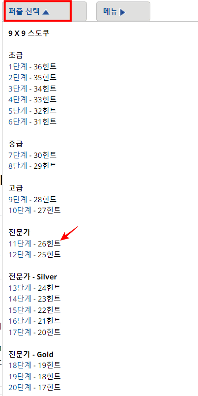 퍼즐 하단에서 퍼즐 선택 메뉴를 클릭하면 초급, 중급, 고급, 전문가에 해당하는 다양한 레벨들을 확인할 수 있습니다. 11단계 전문가 레벨을 선택해 보겠습니다.