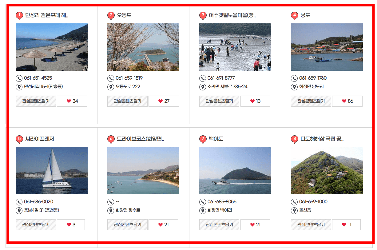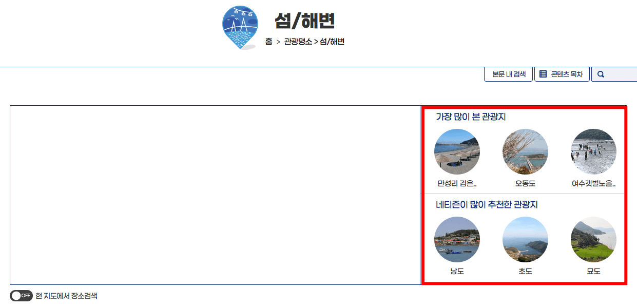 이번에는 여수시의 아름다운 섬/해변을 선택해 보겠습니다. 페이지 우측의 가장 많이 본 관광지와 네티즌이 많이 추천한 관광지를 먼저 확인하는 것도 좋은 방법입니다. 스크롤을 내리면 오동도, 만성리 검은 모래 해변, 여수갯벌 노을마을, 낭도 등 추천되는 관광지를 상세히 확인할 수 있으니 직접 확인해 보시기 바랍니다.