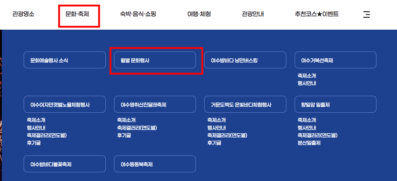 여수시청 관광 홈페이지에서 문화축제를 조회해 보려면 상단 메뉴에서 [문화축제] > [월간문화행사] 메뉴를 선택합니다. 여행 계획을 세우시는 중이라면 이 달력을 참고하여 여행일자와 보고 싶은 문화행사를 매칭시키는 것도 좋은 방법입니다. 달력 내의 문화축제를 마우스로 클릭하면 행시기간과 시간 및 장소를 확인할 수 있습니다.