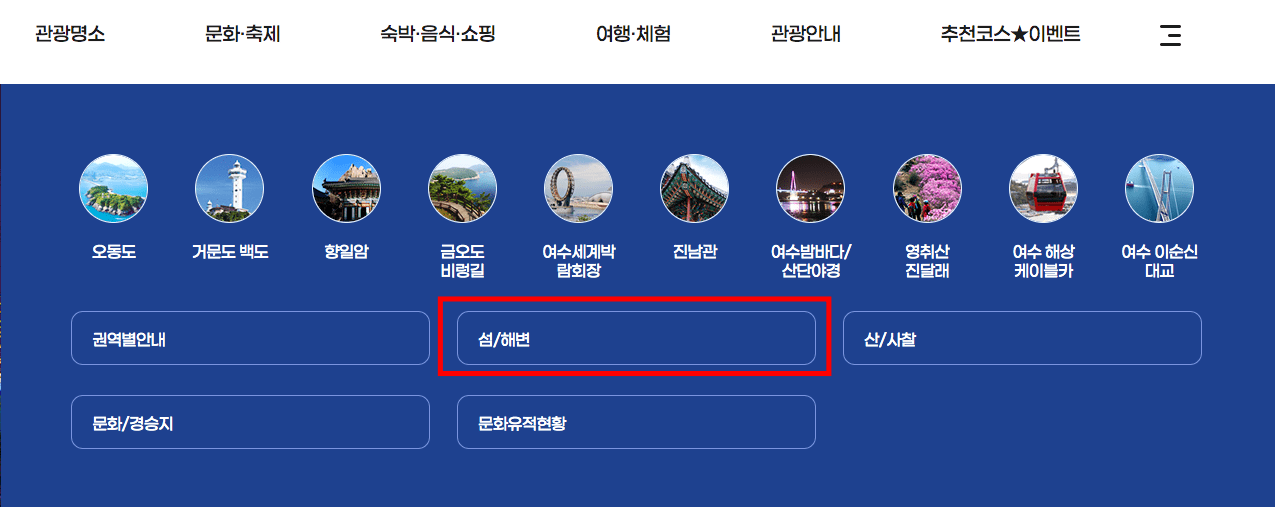 여수시 관광 홈페이지에 방문하시면 위와 같은 메인 화면을 보게 됩니다. 상단 메뉴에서 관광명소로 마우스를 가져갑니다. 하단에 세부 메뉴가 표시되면 [권역별안내] 메뉴를 클릭합니다.