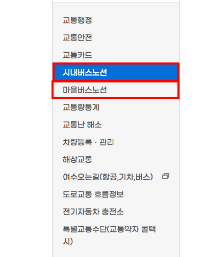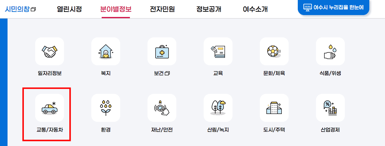 여수시에서 생활을 하려면 교통정보를 파악하는 것이 좋습니다. 분야별정보 > [교통/자동차] 메뉴를 선택합니다. 여수시에는 시내버스 9개 업체와 전세버스 18개 업체가 있으며 택시 이용도 가능합니다. 자차가 있으시다면 주차장 현황을 살펴보는 것도 권장드립니다.