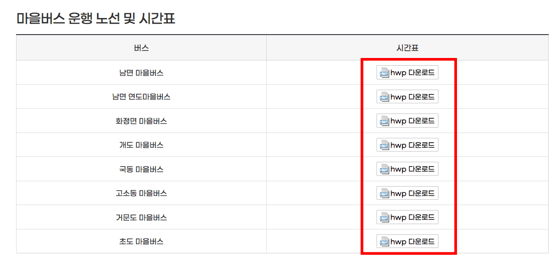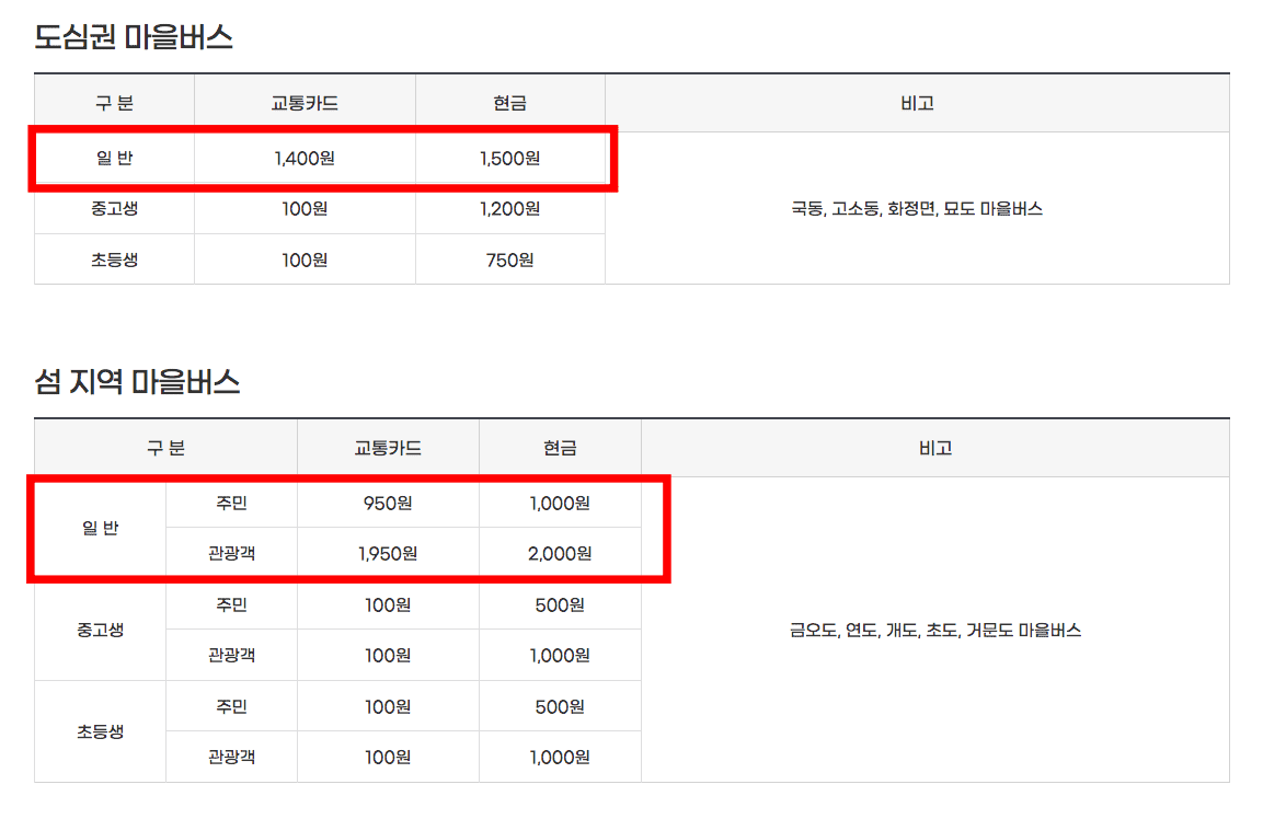 마을버스의 경우 도심권 마을버스는 일반 시내버스와 요금이 같지만 섬 지역 마을버스는 관광객의 경우 교통카드 1950원, 현금 2000원이니 참고하시기 바랍니다. 스크롤을 내리면 하단에서 마을버스 운행 노선 및 시간표를 저장할 수 있습니다.