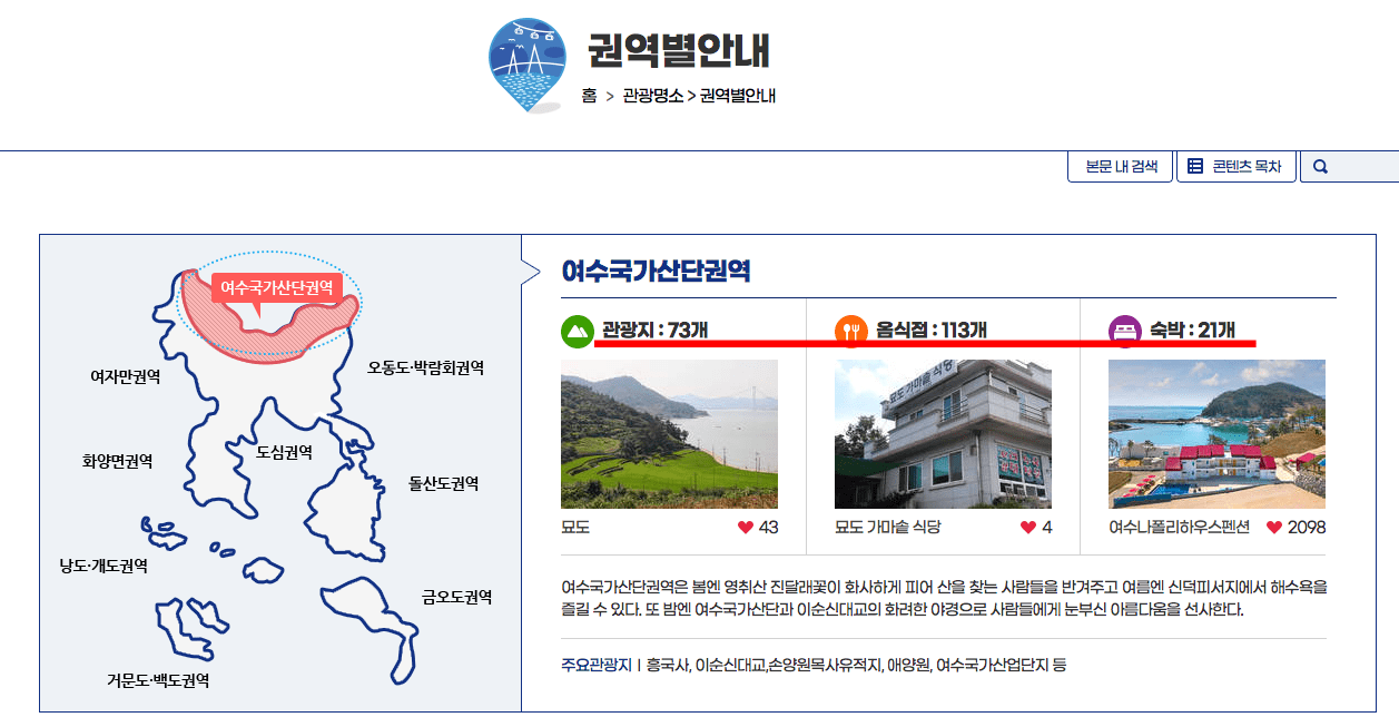 여수시에는 여수국가산단권역, 여자만권역, 화양면권역, 도심권역, 오동도 박람회권약 등 다양한 권역이 있습니다. 각 권역의 관광지, 음식점, 숙박시설 개수 확인이 가능합니다. 스크롤을 내리면 관광지나 음식점, 숙박시설에 대한 자세한 정보 확인이 가능합니다.