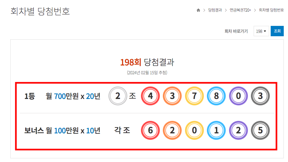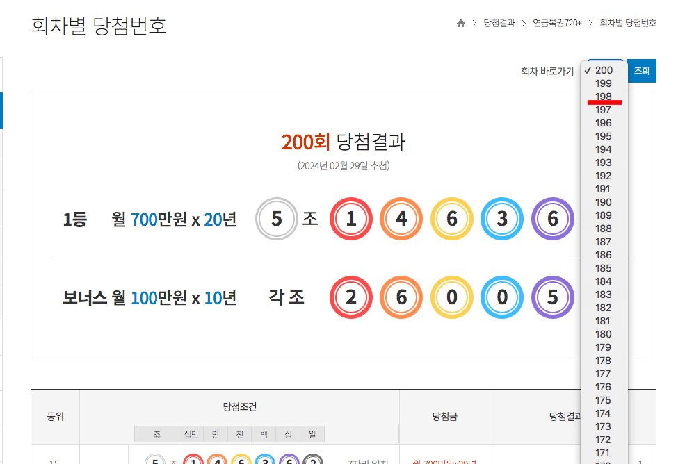 만약 지난 회차의 당첨번호를 확인하고 싶으시다면 우측 상단의 회차바로가기를 선택하여 원화는 회차를 선택합니다. 여기에서는 198회 차를 선택해 보았습니다. 198회 당첨번호를 확인할 수 있으며 하단에서 동일한 당첨조건을 확인할 수 있습니다.