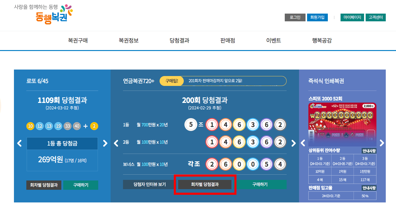 동행복권 홈페이지에 방문하시면 위와 같은 페이지를 볼 수 있습니다. 현재 200회 당첨결과를 바로 확인할 수 있으며 하단 회차별 당첨결과를 클릭하면 자세한 당첨번호 확인이 가능합니다.