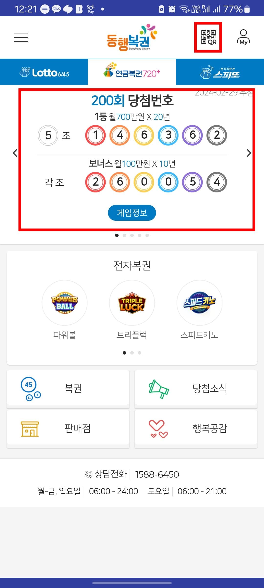 동행복권 앱을 설치하고 실행해 보시면 위와 같은 화면을 볼 수 있습니다. 메인 페이지에서 바로 200회 당첨번호를 확인할 수 있으며 우측 상단의 QR코드 이모티콘을 선택하면 자신의 연금복권에 표시된 QR코드를 촬영하여 한번에 당첨결과를 확인할 수 있습니다.