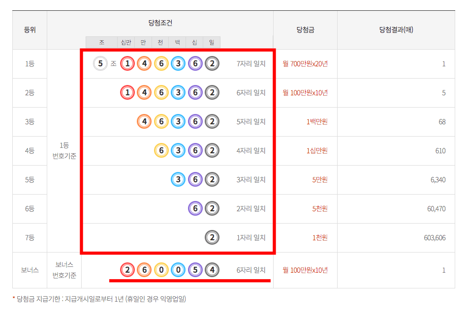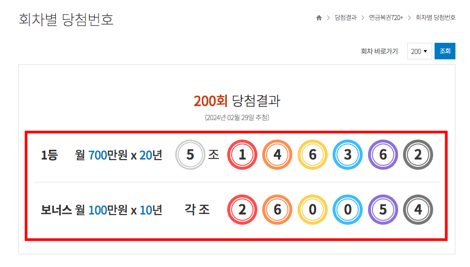 200회 당첨번호는 5조146362와 보너스 번호 260054로 1등에서 7등까지의 당첨번호는 위의 당첨조건에서 확인할 수 있습니다. 1등의 제외한 모든 등수에서는 조가 일치할 필요가 없으면 6자리부터 1자리 숫자가 일치하는 경우 당첨금을 지급받을 수 있습니다. 보너스 번호의 경우 조와 무관하게 6자리가 일치하면 당첨금을 받을 수 있습니다.