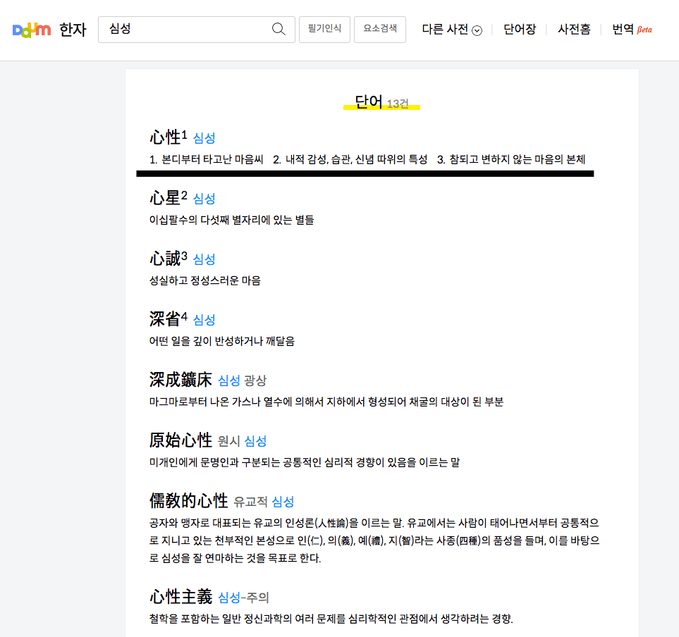 검색결과를 확인하시면 ‘심성’에 대한 한문과 뜻을 확인할 수 있습니다. 만약 각 한문의 뜻이 궁금하시다면 해당 한문을 마우스로 드래그하여 검색창에 복사 및 붙여 넣기를 합니다.