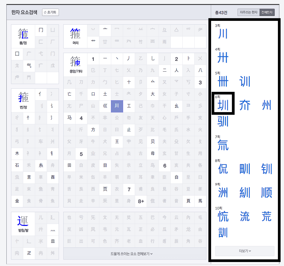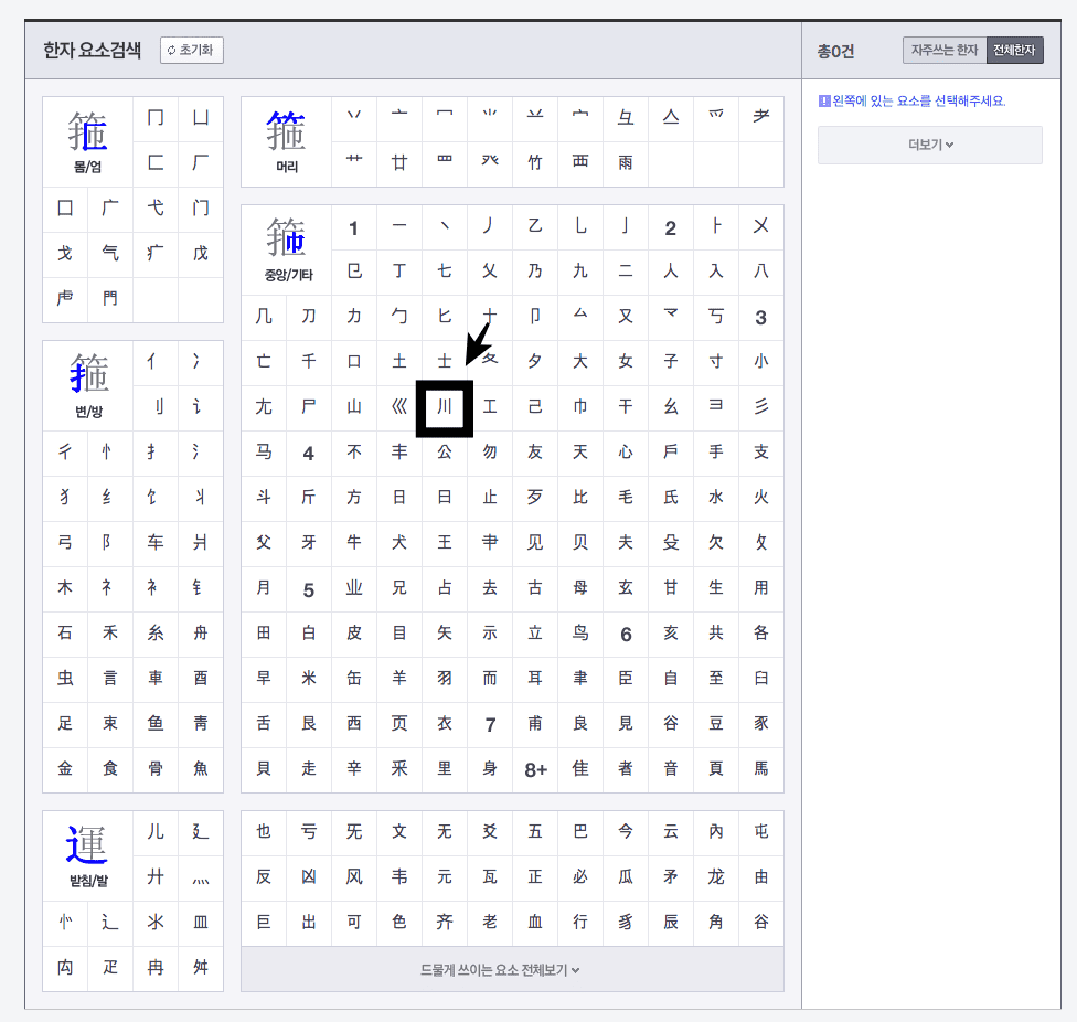 이후 우측에 해당 부수가 포함된 한문들이 획수 별로 표시되는 것을 확인할 수 있습니다.원하는 한문을 찾았다면 마우스로 클릭해 봅니다. 결과를 확인하시면 해당 한자가 사용된 단어에 대해 확인할 수 있습니다.