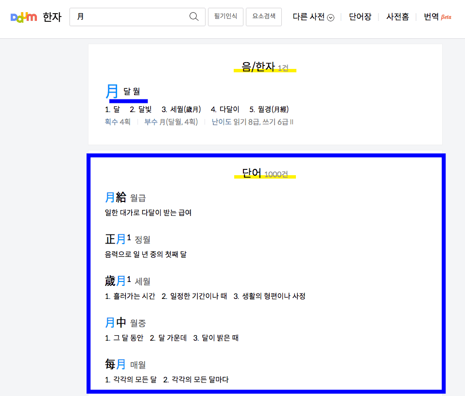 검색결과를 확인해 보니 달 월이라는 한자의 뜻과 획수, 부수, 사용된 단어들을 자세히 확인해 볼 수 있었습니다.