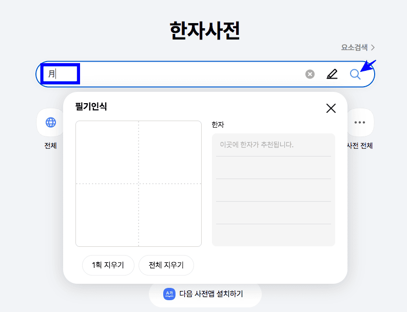 다음 한자사전에서는 옥편에는 없는 한문을 써서 찾을 수 있는 기능을 제공하고 있습니다. 첫 페이지 검색창 우측에서 연필 모양의 아이콘을 클릭합니다. 하단에 [필기인식] 창이 표시되면 우측의 사각형 안에 찾고자 하는 한자를 마우스로 그려줍니다.