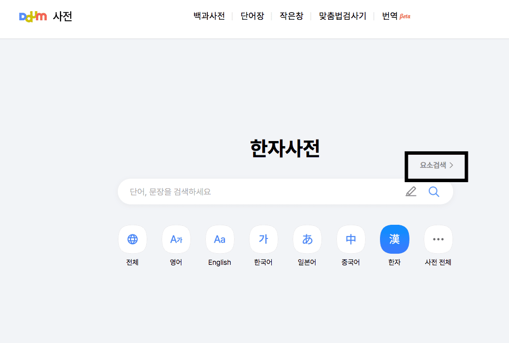 다음 한자사전 페이지에 도착하시면 위와 같은 화면을 볼 수 있습니다. 검색창 우측상단의 [요소검색] 메뉴를 마우스로 클릭합니다. 한자 요소검색 페이지가 표시되면 찾고자 하는 한문의 부수를 선택합니다.