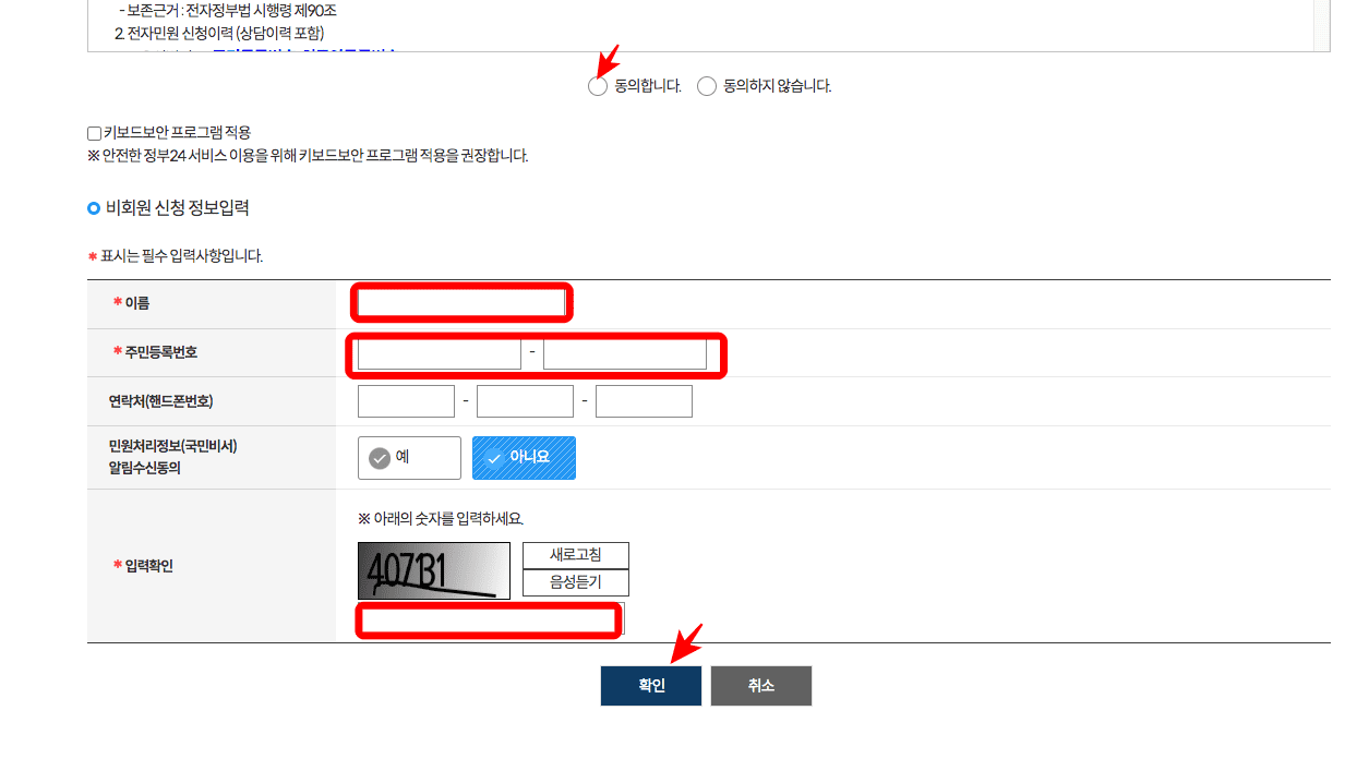 회원/비회원 신청 페이지가 표시되면 비회원 신청하기를 선택합니다. 개인정보 및 고유식별부호에 대한 동의를 하시고 하단에 이름, 주민등록번호, 입력확인 숫자를 입력한 뒤 하단의 확인 버튼을 클릭합니다.