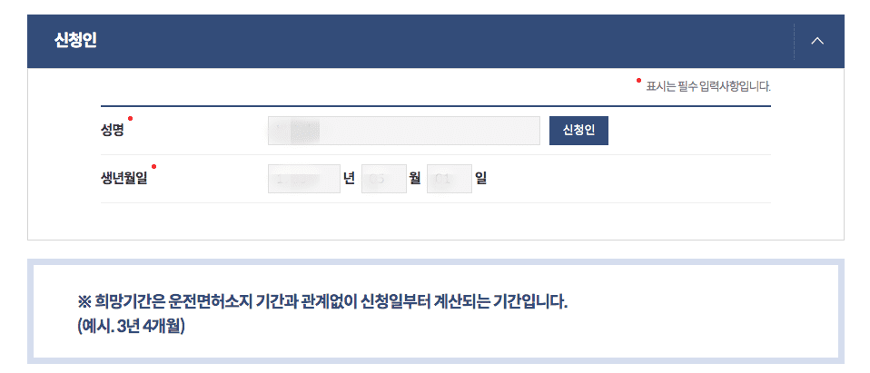 신청인의 성명과 생년월일을 확인합니다. 운전면허경력, 법규위반, 교통사고 등 모든 항목을 전체경력으로 표시합니다. 신청내용에는 취업, 자동차 보험 가입 등 간단한 발급사유를 입력합니다.