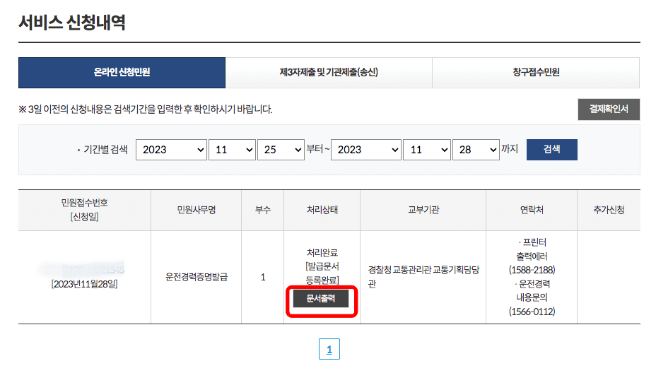 모든 인증을 마치면 서비스 신청내역에서 운전경력증명서가 발급된 것을 확인할 수 있습니다. 하단 문서출력 버튼을 선택합니다.