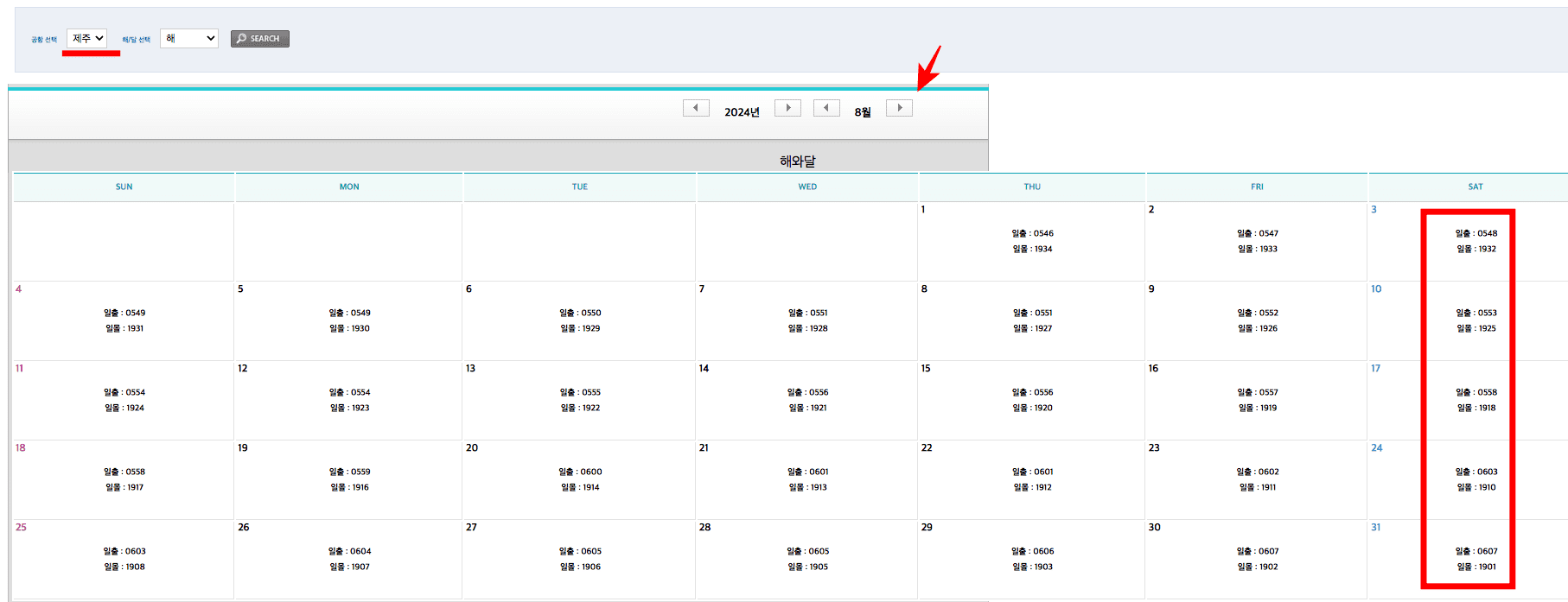 일출 일몰 시간 조회 방법 (항공기상청)