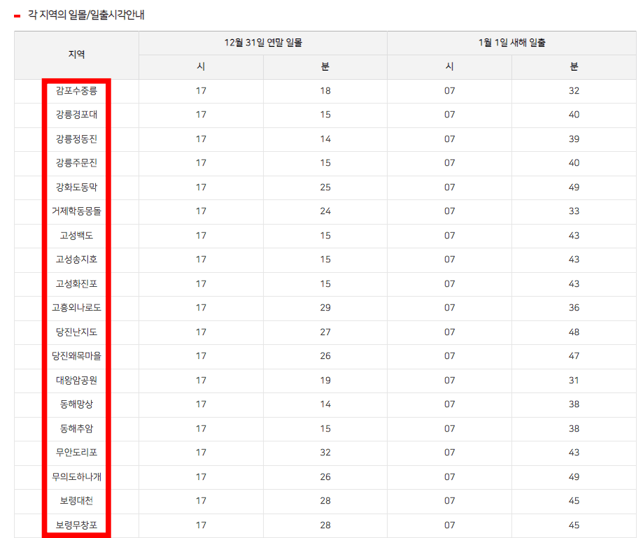 페이지 상단의 [주요 명소의 연말 일몰 시각 및 새해 일출 시각] 메뉴를 클릭하면 연말이나 새해 일출 일몰을 볼 수 있는 명소도 확인할 수 있습니다. 감포수중릉, 강릉경포대, 강릉주문진, 보령대천, 무안도리포 등 다양한 명소를 확인할 수 있으니 참고하시기 바랍니다.