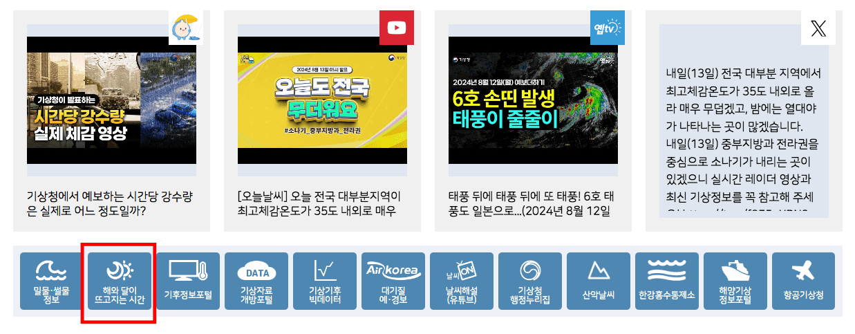 기상청 날씨누리 홈페이지에 방문하시면 스크롤을 내려 하단의 메뉴 박스가 보이도록 합니다. 메뉴 박스 두 번째에 있는 [해와 달이 뜨고 지는 시간] 메뉴를 선택합니다.