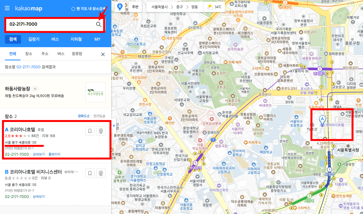 이번에도 코리아나 호텔 그리고 좌측 전화번호와 연결된 주소지가 검색되는 것을 확인할 수 있습니다.