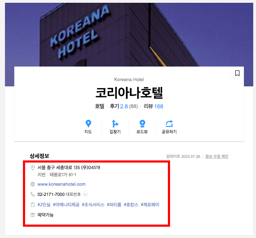 이번에는 서울 중구 세종대로 135에 위치한 ‘코리아나호텔’ 이 검색되었습니다. 호텔 명을 클릭하면 주소, 지번 주소, 홈페이지, 전화번호 등의 상세정보 확인이 가능합니다.