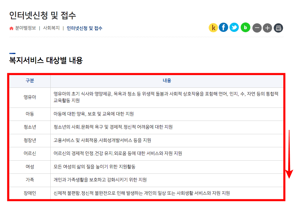복지서비스 대상별 내용을 확인해 보시면 영유아, 아동, 청소년, 청장년, 어르신, 여성, 가족, 장애인 등 다양한 복지 서비스를 확인할 수 있습니다. 확인 후 신청을 원하시면 스크롤을 아래로 내려 복지로 온라인 신청 버튼을 클릭하면 복지로에서 신청이 가능합니다.