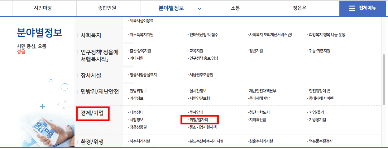 정읍시청 홈페이지 1 - 구인구직 정보