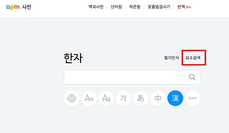 다음 한자 사전 홈페이지에 방문하시면 위와 같은 메인 화면을 볼 수 있습니다. 검색창 우측 상단의 [요소검색] 메뉴를 클릭합니다. 한자 요소검색 페이지에서 원하는 한자 요소를 마우스로 클릭합니다. 이후 해당 요소가 포함된 다양한 한자들을 우측에서 찾아볼 수 있습니다. 원하는 한자가 있다면 클릭해 봅니다.