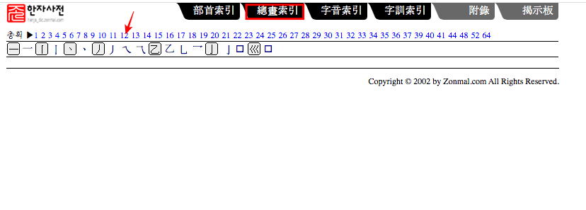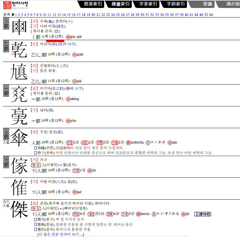 이번에는 총획색인 메뉴를 선택해 보았습니다. 총획색인은 획수로만 한자를 검색하는 방법입니다. 12획을 선택하니 굉장히 많은 한자들이 페이지에 표시되는 것을 확인할 수 있습니다. 아무 한자나 클릭해 보면 모든 12획 한자가 화면에 표시되는 것을 볼 수 있습니다.