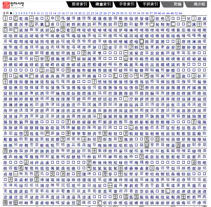 검색결과를 확인하니 해당 모양자로 구성된 한자들을 찾아볼 수 있습니다.