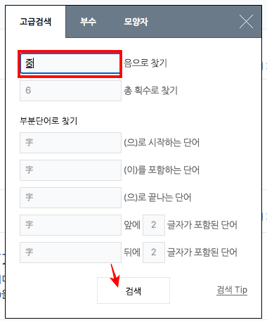 이번에는 고급검색 우측의 부수로 검색을 이용해 보겠습니다. 원하는 부수를 선택하시고 하단의 검색 버튼을 클릭합니다.