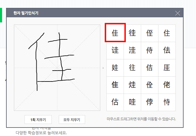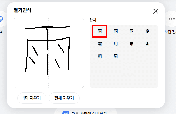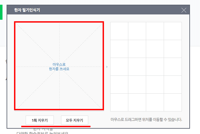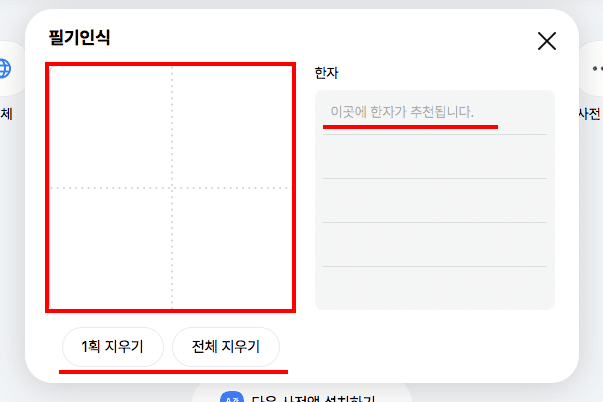 한자 단어를 필기인식을 통해 연습해 볼 수 있습니다. 한자가 입력되어 있는 상태에서 상단 검색창 우측 필기인식을 마우스로 클릭하면 다시 필기인식 창이 표시됩니다.