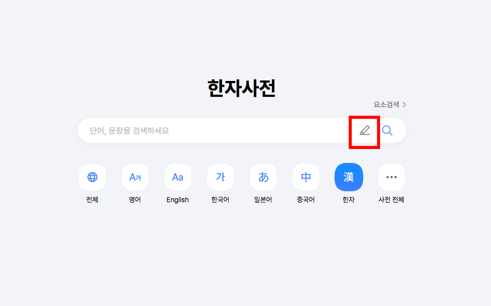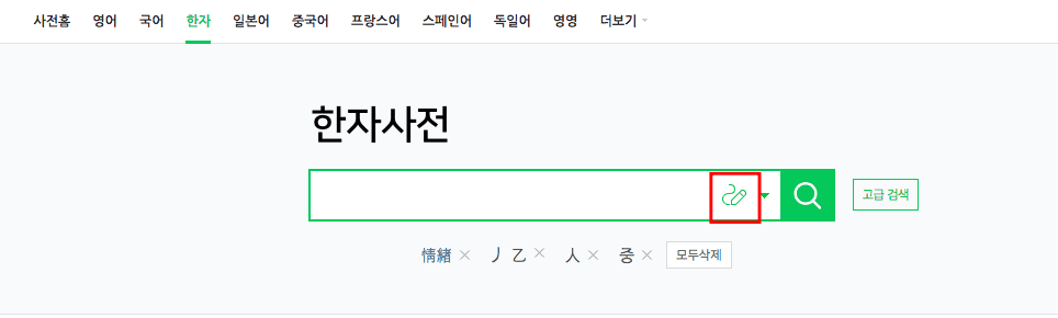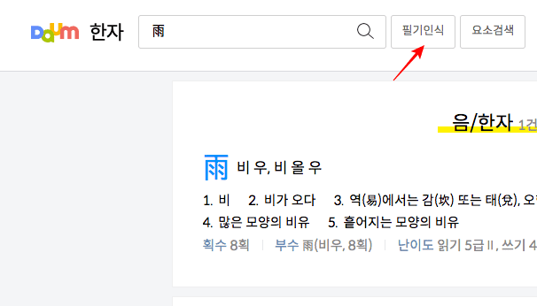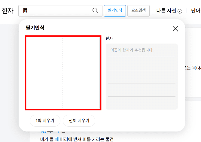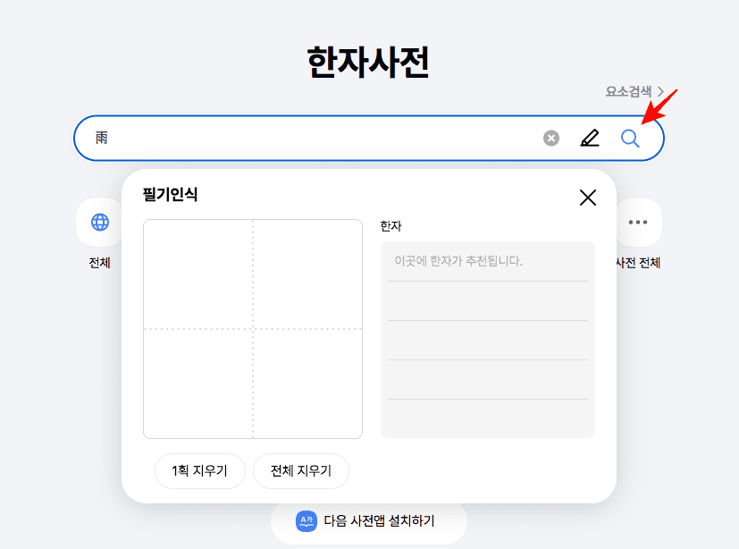 다음 한자 사전 페이지에 도착하시면 위와 같은 메인 화면을 볼 수 있습니다. 검색창 오른쪽의 연필 아이콘을 선택합니다. 필기인식 창이 표시되면 왼쪽 사각형 안에 한자를 마우스로 그리면 오른쪽에 추천 한자들이 표시됩니다. 만약 한자를 잘못 그렸다면 하단의 1획 지우기 또는 전체지우기를 클릭하여 수정할 수 있습니다.