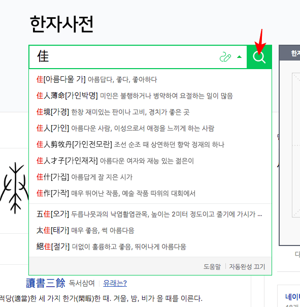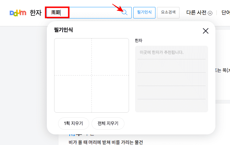한자 필기인식기에 한자를 입력하니 오른쪽에 추천 한자들이 표시됩니다. 가장 유사한 한자를 선택합니다. 검색창에 선택한 한자가 입력되었다면 오른쪽 돋보기 아이콘을 클릭하여 결과를 확인합니다.