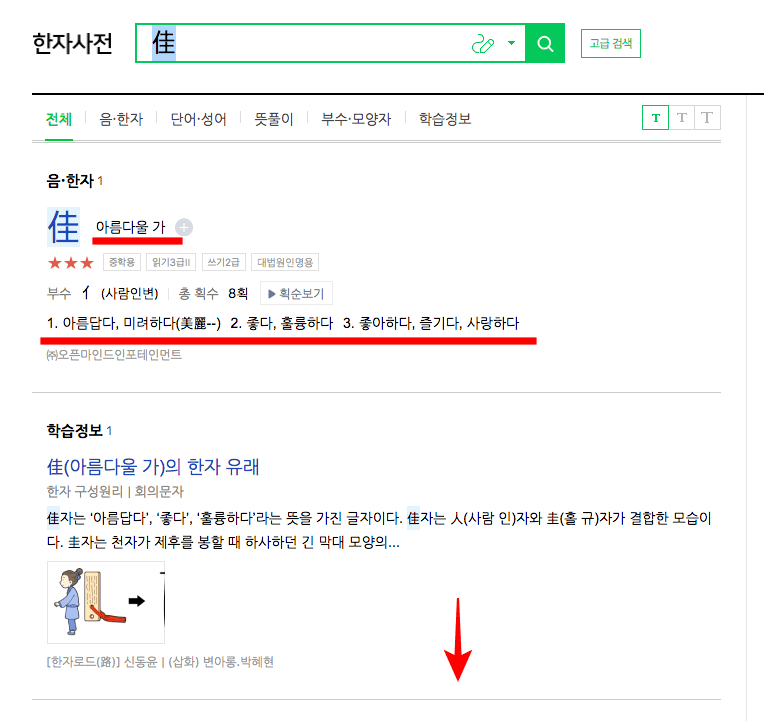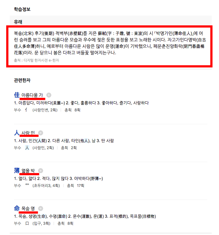 해당한자는 아름다울 가, 로 아름답다, 좋다, 좋아하다 등의 뜻을 가지고 있습니다. 스크롤을 내리면 아름다울 가가 사용된 다양한 단어와 성어를 찾아볼 수 있습니다. 가인박명이라는 성어가 눈에 들어와 유래를 클릭해 보았습니다. 가인박명에 대한 유래는 물론 해당 성어의 모든 한자들의 뜻과 총획수도 확인이 가능합니다.