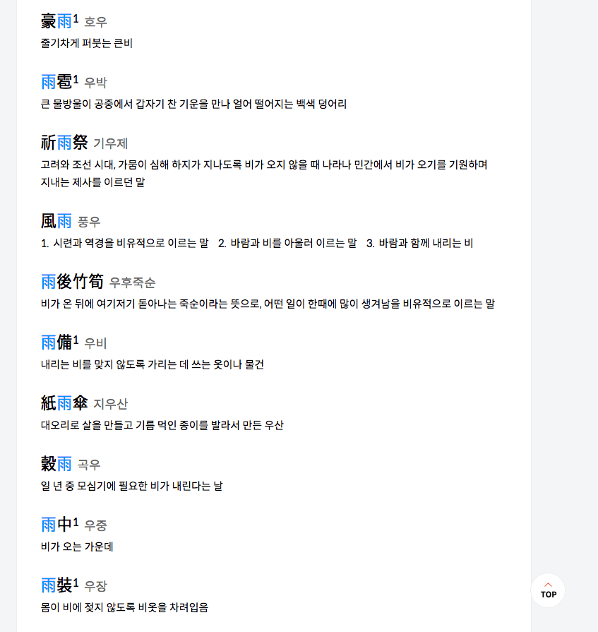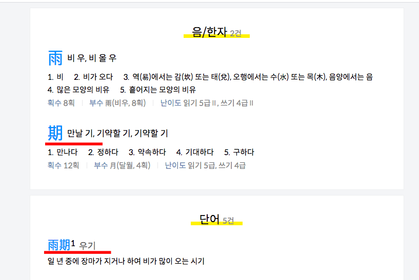 두 번째 한자는 만날 기, 이며 비 우와 합쳐져 일 년 중에 장마가 지는 시기를 말하는 ‘우기’라는 단어가 되는 것을 확인할 수 있었습니다.