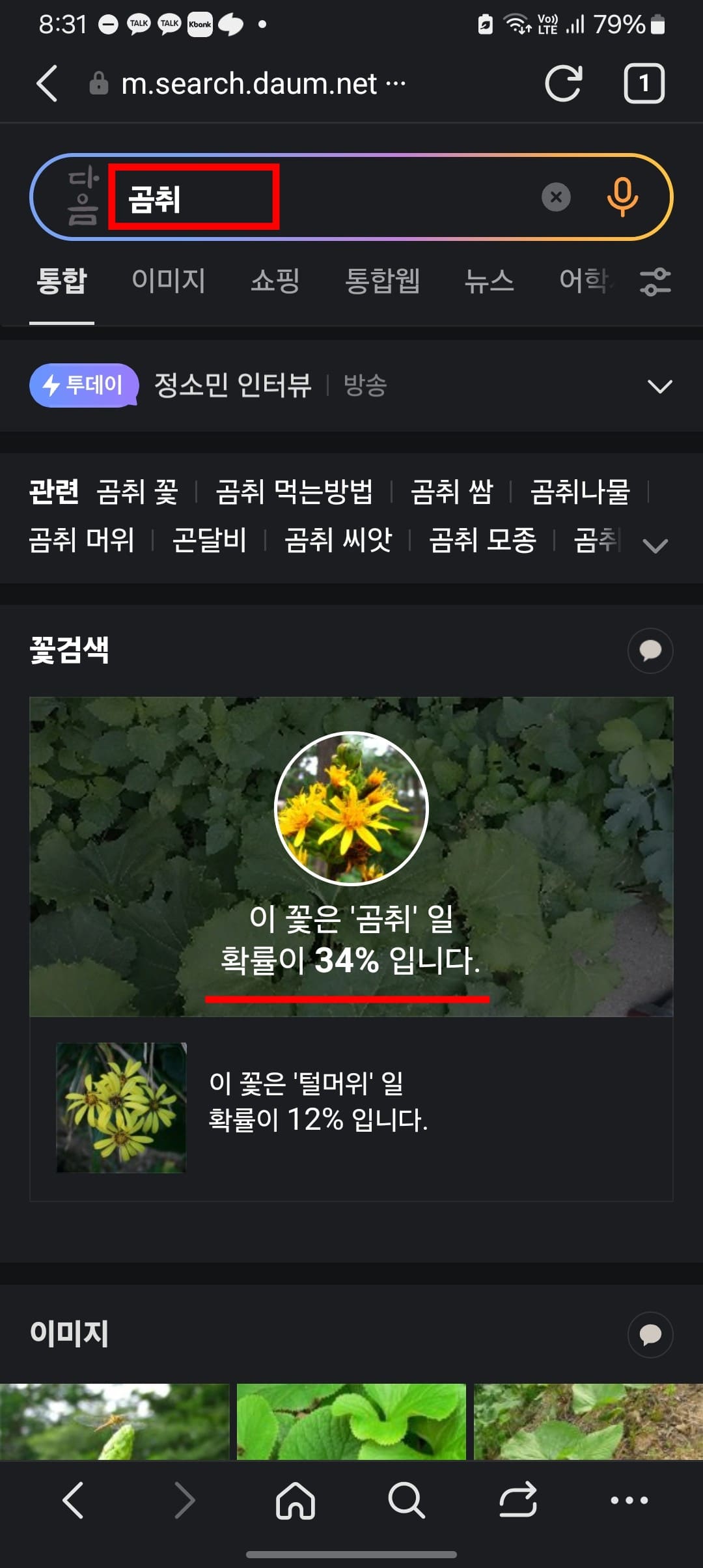 카메라가 활성화되면 이름을 알고 싶은 화초가 꽃 모양 안에 들어오게 겨냥한 후 하단의 촬영버튼을 터치합니다. 검색결과를 확인하시면 해당 화초의 이름이 곰취인 것을 확인할 수 있습니다. 확률이 34%로 표시되는 것은 촬영에 따라 상이해지니 참고만 하시기 바랍니다.
