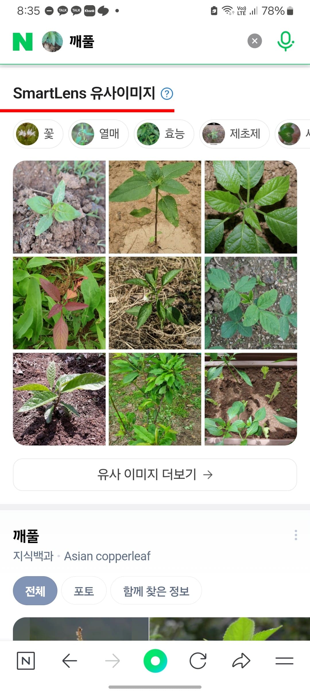 네이버 앱의 카메라가 활성화 되면 이름을 알고 싶은 화초를 겨냥한 후 하단의 스마트렌즈 촬영버튼을 터치합니다. 네이버 검색 결과를 확인하시면 해당 화초의 이름이 깨풀이라는 것을 알 수 있습니다.