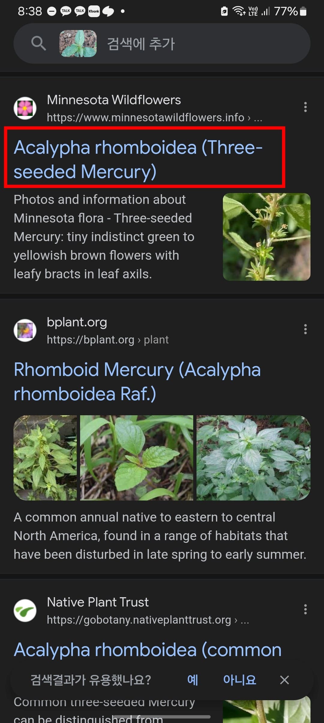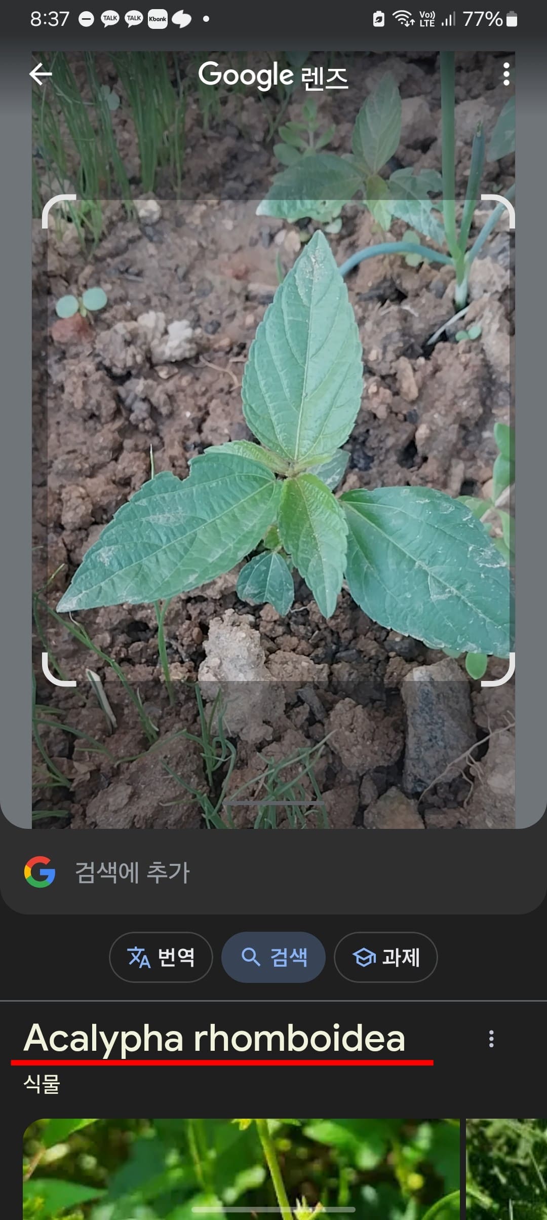 구글 앱의 카메라가 활성화 되면 검색을 원하는 화초를 겨냥하고 하단의 촬영 버튼을 터치합니다. 검색결과를 확인하시면 깨풀의 학명이 검색되는 것을 확인할 수 있습니다. 구글 앱을 사용하면 영문으로 된 자세한 정보를 검색해 볼 수 있으니 위에 소개한 방법들과 함께 활용해 보면 좋을 것입니다.