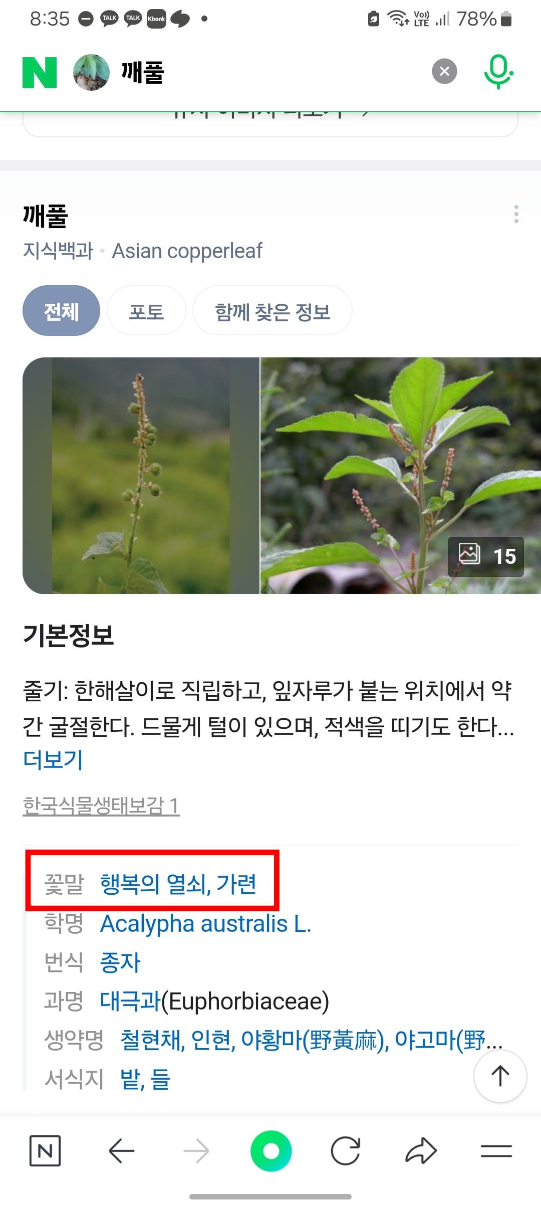 스크롤을 내리면 다른 사람들이 촬영한 깨풀 사진이나 화초의 꽃말과 학명, 서식지 등도 확인할 수 있으며 학국식물생태보감에 수록된 내용도 확인할 수 있으니 참고하시기 바랍니다.