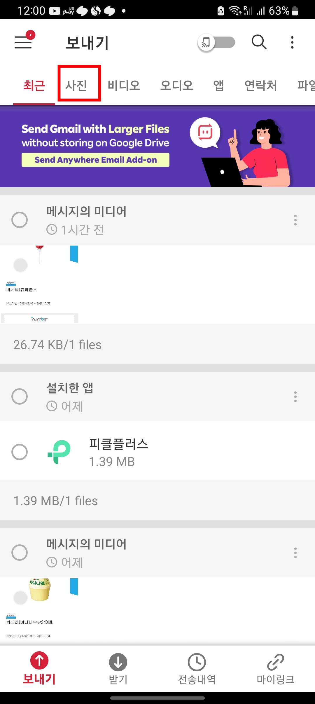 Send Anywhere에서는 사진뿐만 아니라 비디오, 오디오, 앱, 연락처 등 다양한 정보를 PC나 모바일로 이동할 수 있습니다. 상단 메뉴에서 사진 메뉴를 터치합니다. 이후 사진이 촬영된 요일을 선택하거나 옮길 이미지 파일을 하나씩 선택해 줍니다.