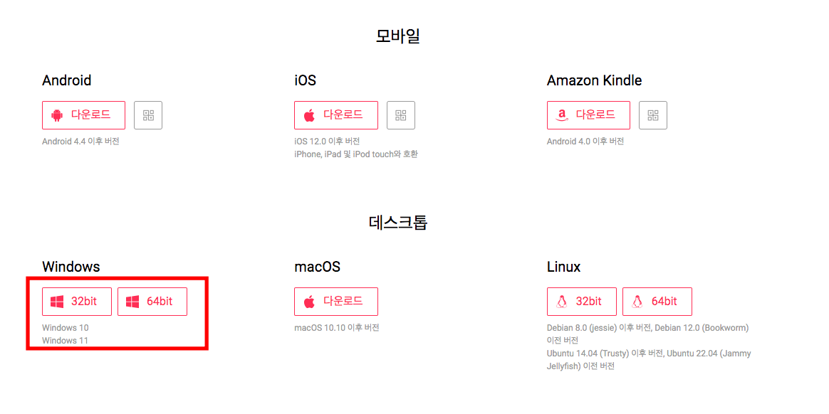 위의 화면에서 볼 수 있듯이 윈도, 맥 OS, 리눅스 중 자신이 소유한 운영체제를 선택하여 설치파일을 저장하고 실행합니다.
