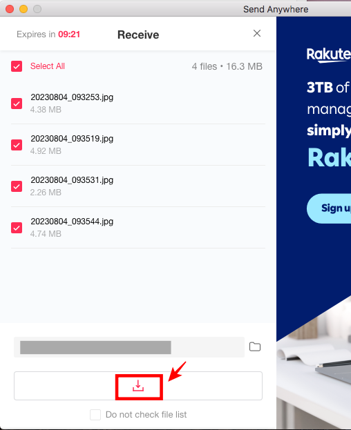 다시 컴퓨터에서 Send Anywhere 프로그램을 실행하시고 하단 Receive 입력란에 6자리의 고유번호를 입력하고 Enter 버튼을 클릭합니다. 휴대폰에서 전송한 4개의 이미지 파일이 보이면 하단의 다운로드 아이콘을 클릭합니다.