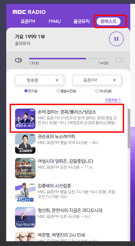만약 사연보다 음악청취만 하고 싶은 분이라면 [올댓뮤직] 메뉴를 권장드립니다. 팟캐스트는 경제나 유머와 같은 콘텐츠를 청취할 수 있습니다. 팟캐스트 목록을 보시고 마음에 드는 콘텐츠를 클릭합니다.