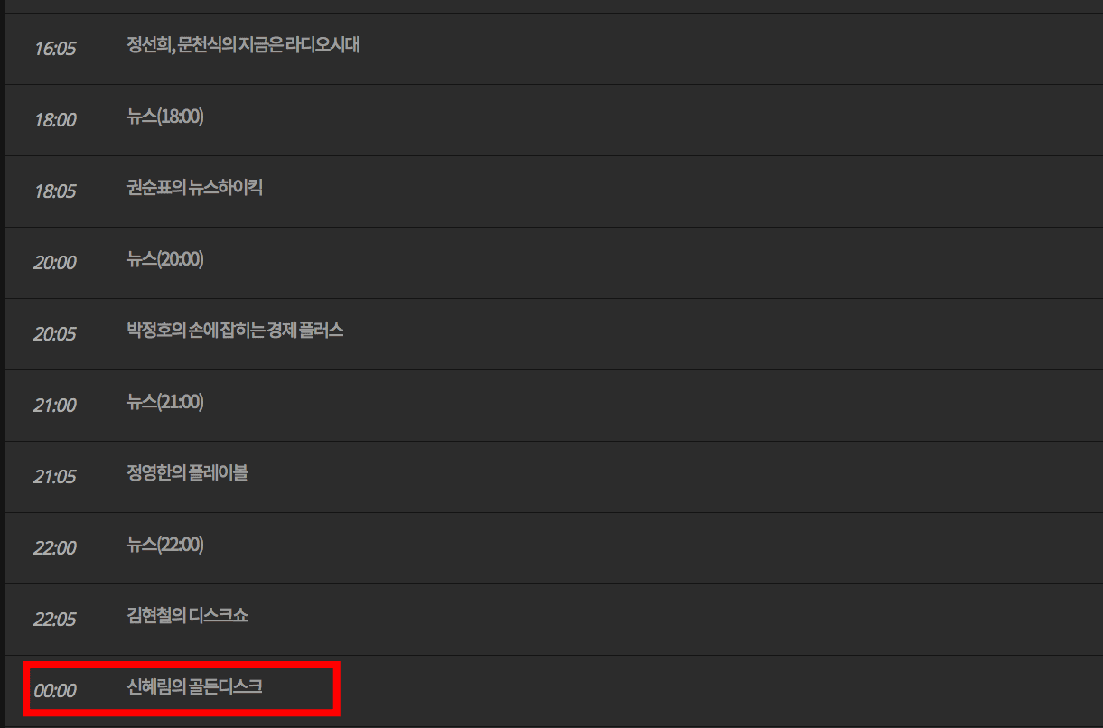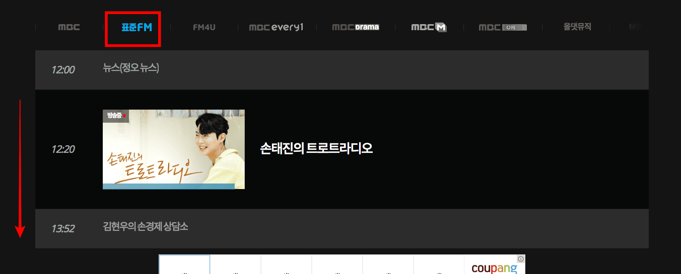 표준 FM을 선택하니 위와 같이 시간별 프로그램을 확인할 수 있습니다. 스크롤을 내려봅니다. 원하는 라디오 프로그램을 찾았다면 마우스로 클릭합니다.