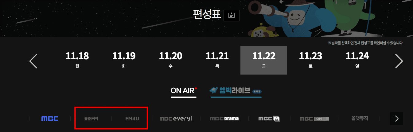 MBC라디오 홈페이지에 방문하시면 먼저 페이지 우측 상단 끝에 있는 [편성표] 메뉴를 선택합니다. 편성표를 보시면 먼저 날짜를 선택하고 하단에서 표준 FM, FM4U, 올댓뮤직 등에서 원하는 채널을 선택합니다.