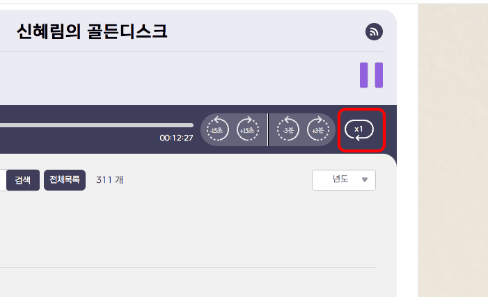 해당 콘텐츠 목록이 보이게 되면 원하는 회차의 콘텐츠를 클릭하면 바로 재생이 됩니다. 다시 뒤로 가시려면 재생바 좌측 하단의 화살표 버튼을 클릭합니다. 팟캐스트도 채널에 따라 선택하여 청취할 수 있다는 점도 기억하시기 바랍니다.