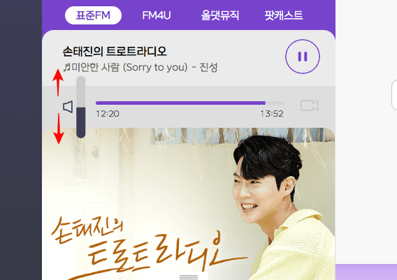 라디오 볼륨을 조절하시려면 재생바 좌측의 스피커 아이콘에 마우스를 가져가면 위와 같은 볼륨 설정 메뉴가 표시되는 것을 볼 수 있습니다. 위로 드래그하시면 볼륨이 커지고 아래로 드래그하시면 볼륨이 작아집니다. 또한 MBC 홈페이지에 회원가입이 되어 있다면 로그인 후 실시간 라디오에 문자를 보낼 수 있으니 참고하시기 바랍니다.